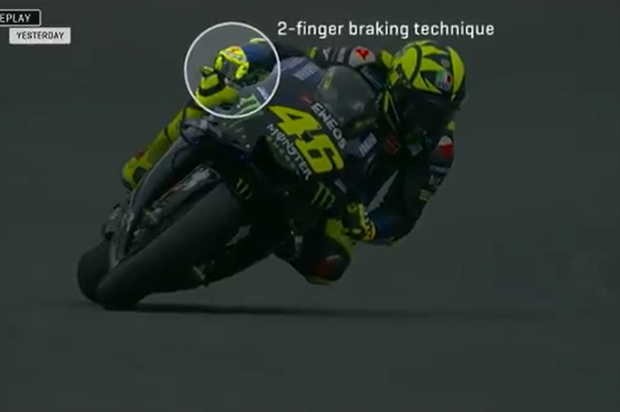 Hal itu tampak dari video yang diunggah Twitter MotoGP, terlihat jelas The Doctor, julukan Valentino Rossi, menggunakan teknik pengereman yang sedikit bereda dari biasanya.