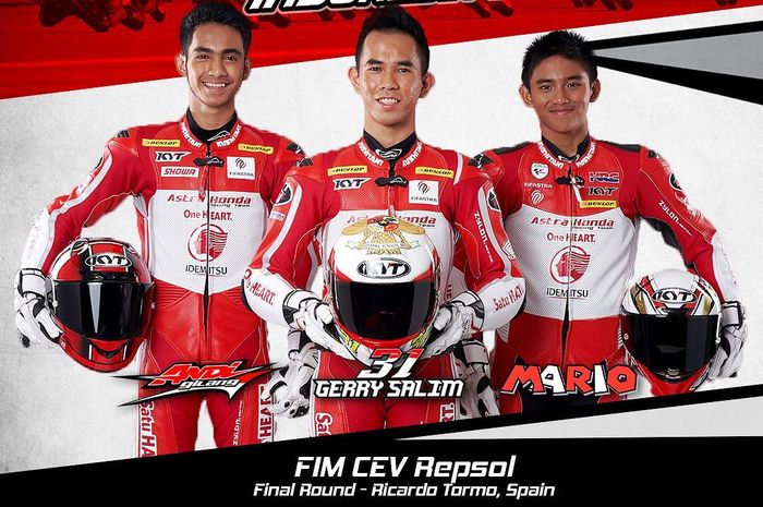 Mereka adalah Andi Farid Izdihar dan Gerry Salim di CEV Moto2 alias Moto2 European Championship dan Mario Suryo Aji di CEV Moto3 alias Moto3 Junior World Championship.