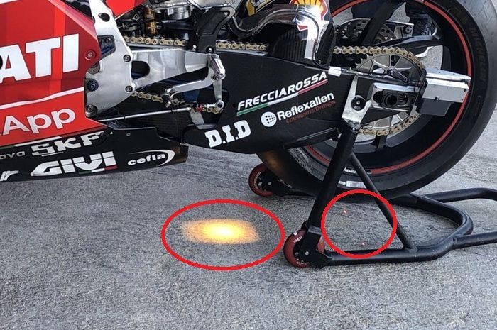 Ketangkep basah alias ketahuan, di bawah swinga rm Desmosedici GP milik Michele Pirro sebagai test rider Ducati memancar sinar atau cahaya yang menyorot ke aspal.
