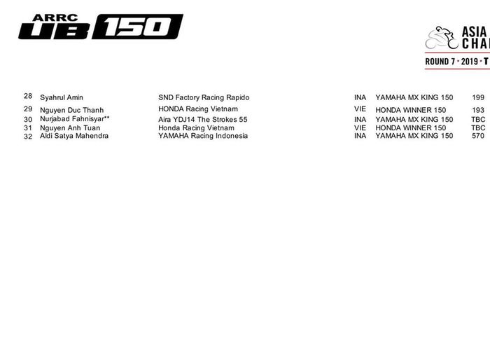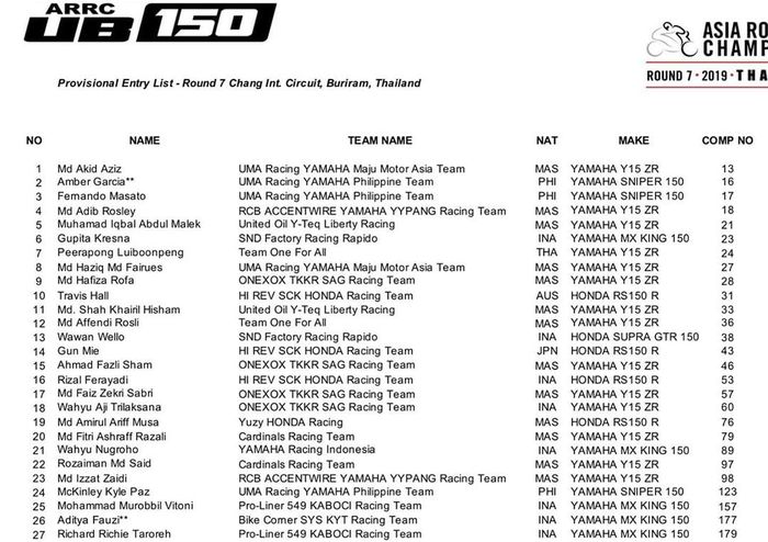Berikut ini, daftar nama pembalap di kelas UB150 Final ARRC 2019 Thailand: