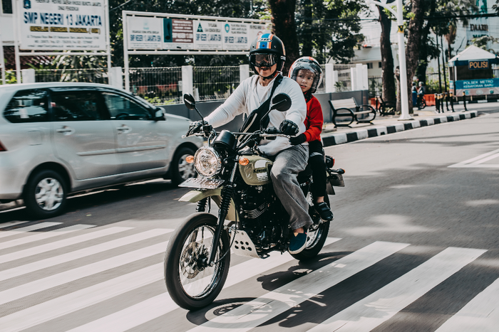 Menggunakan Kawasaki W175TR berboncengan dengan anak menjadi perhatian dari peserta sunmori.