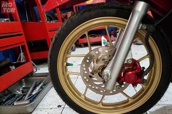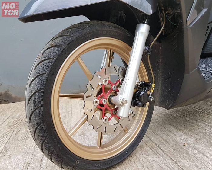 "Kalau diameter piringan cakram aslinya itu cuma 190 mm, atas saran bengkel akhirnya upgrade pakai piringan yang diameternya 220 mm," kata Dedi yang menyerahkan Honda Vario 150 miliknya digarap oleh bengkel Erlan View ini.