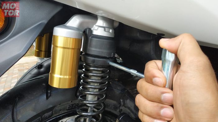 Untuk menyetel preload belakang, tinggal mencolok lubang di bagian plastik di atas sokbreker.