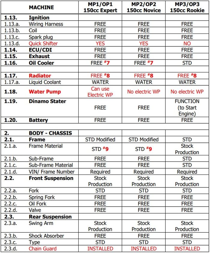 Yaitu, MP1/OP1 (Bebek 4-tak 150 cc Expert), MP2/OP2 (Bebek 4-tak 150 cc Novice), MP3/OP3 (Bebek 4-tak 150 cc Rookie).