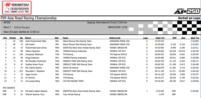 Hasil Race 2 AP250 ARRC Malaysia 2020 :