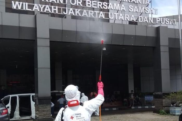 Kepala Samsat Jakarta Pusat, Elling Hartono, mengatakan pihaknya bekerja sama dengan PMI Kota Jakarta Utara menggelar kegiatan penyemprotan disinfektan di kantor bersama ini.