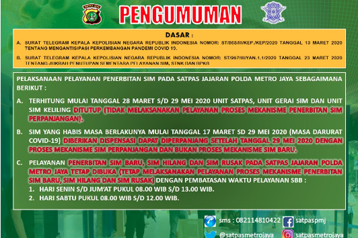 Tapi ingat SATPAS Polda Metro Jaya tidak melayani perpanjangan SIM karena SIM yang masa berlakunya habis dalam wabah virus corona.