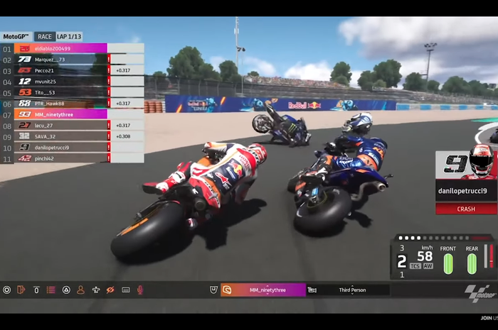 Saat di lap ke 10 MotoGP Virtual Race seri 3, Alex Marquez dan Francesco Bagnaia melakukan kesalahan fatal.