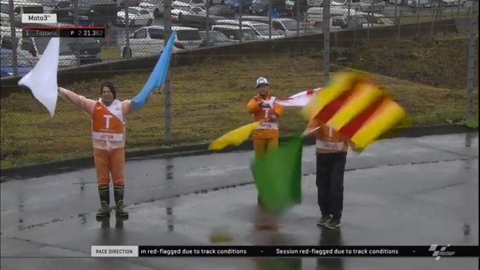 Bendera putih dikeluarkan karena kondisi balapan dengan cuaca yang berubah-berubah.