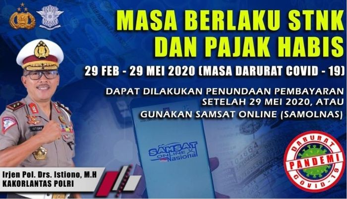 "Masa berlaku STNK dan pajak habis 29 Feb-29 Mei (Masa Darurat Covid-19) dapat dilakukan pendundaan pembayaran setelah 29 Mei 2020," dikutip dari situs resmi Korlantas Polri.