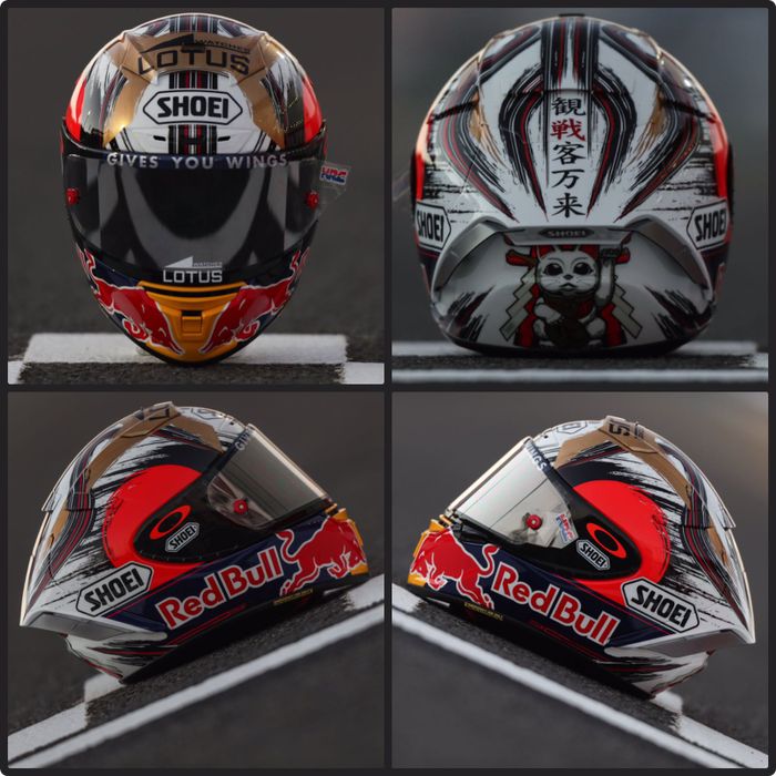 Sebelumnya, Marc Marquez juga pernah memakai helm spesial di MotoGP Jepang 2016, yang punya ciri khas grafis Maneki Neko.