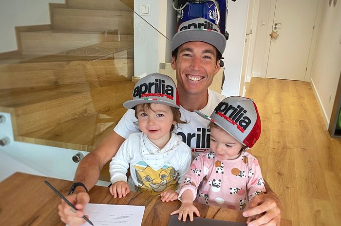 Uniknya lagi, penandatanganan perpanjangan kontrak Aleix Espargaro itu disaksikan oleh putra-putri kembarnya.