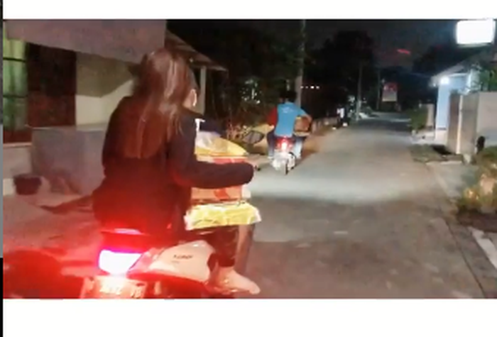 Terlihat Via Vallen membagikan paket sembako yang terdiri dari satu karung beras, satu kardus mie instan, minyak goreng, dan beberapa kebutuhan lainnya.