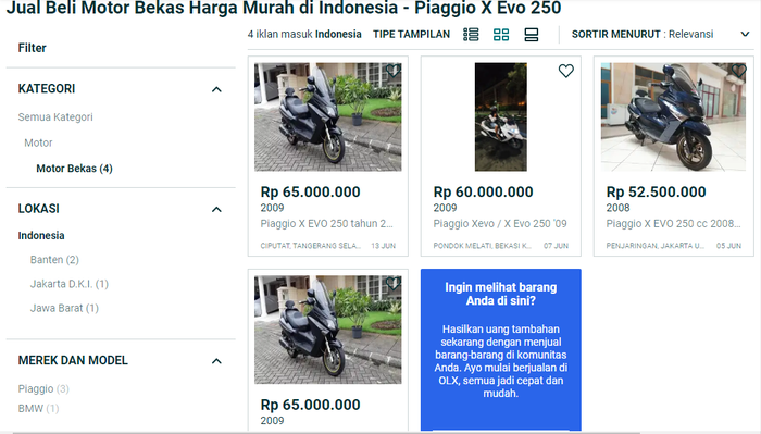 Masih pada situs olx.co.id, harga Piaggio XEvo 250 juga beragam.