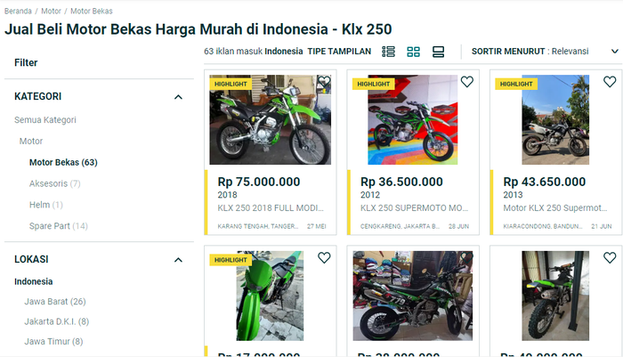 Untuk tipe KLX 250 sudah mulai tersedia di pasaran motor bekas.