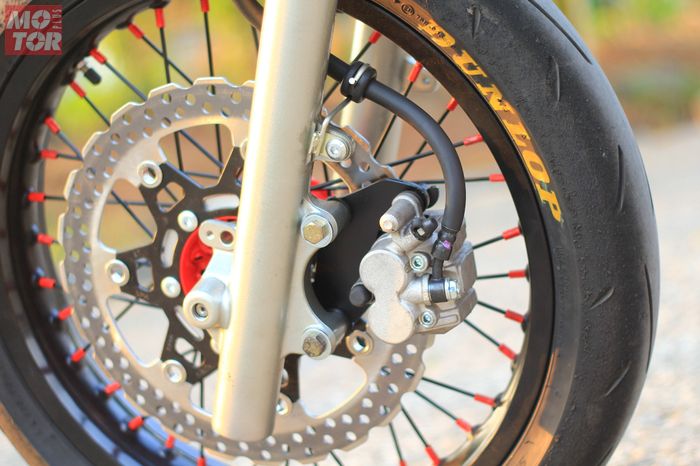 “Karena suka sih bergaya Supermoto. Lagian kalau pakai ban ‘tahu’ tapaknya tipis dan grip ke aspalnya kurang, kurang safety buat di aspal,” bukanya.