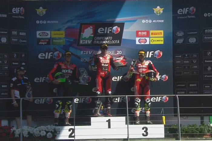 Podium race 2 CIV Superbike 2020 diisi Michele Pirro, Lorenzo Savadori dari Samuele Cavalieri.