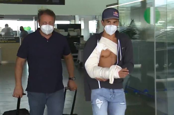 Dalam video itu tampak Marc Marquez dengan kondisi tangan kanan dibalut perban serta penopang.