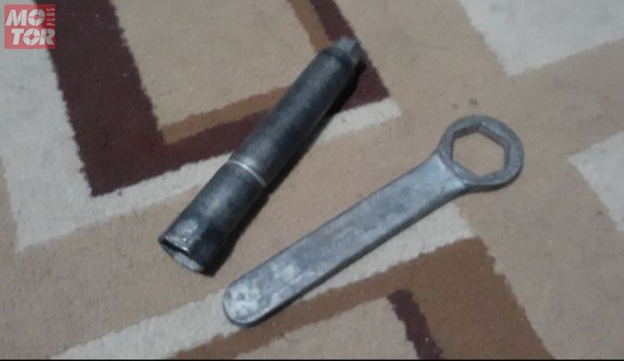 "Sudah diliat nih ternyata bener ujung kunci businya mirip kunci 10, tinggal dimasukkan ke baut pelat lalu atasnya diputer pake besi yang buat kunci busi juga,'