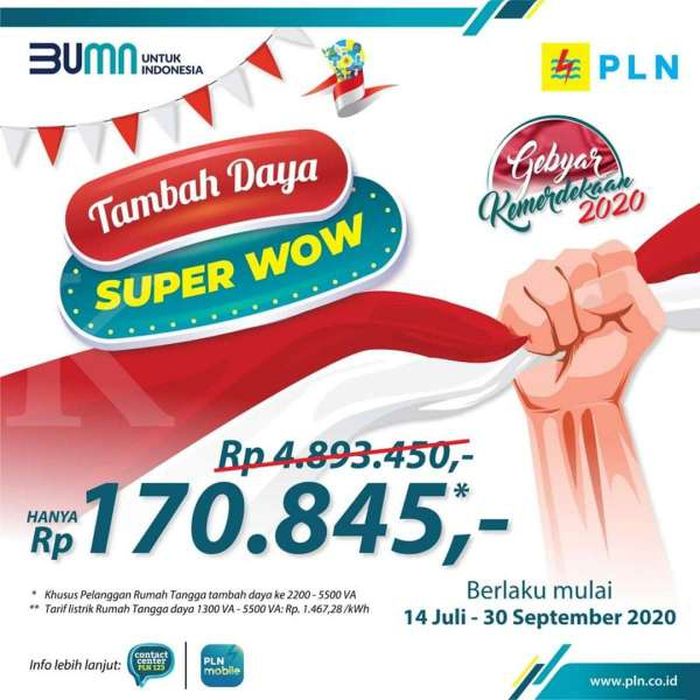 Lewat promo ini pelanggan PLN kategori rumah tangga bisa menambah daya listrik mereka menjadi 2.200 VA hingga 5.500 VA.