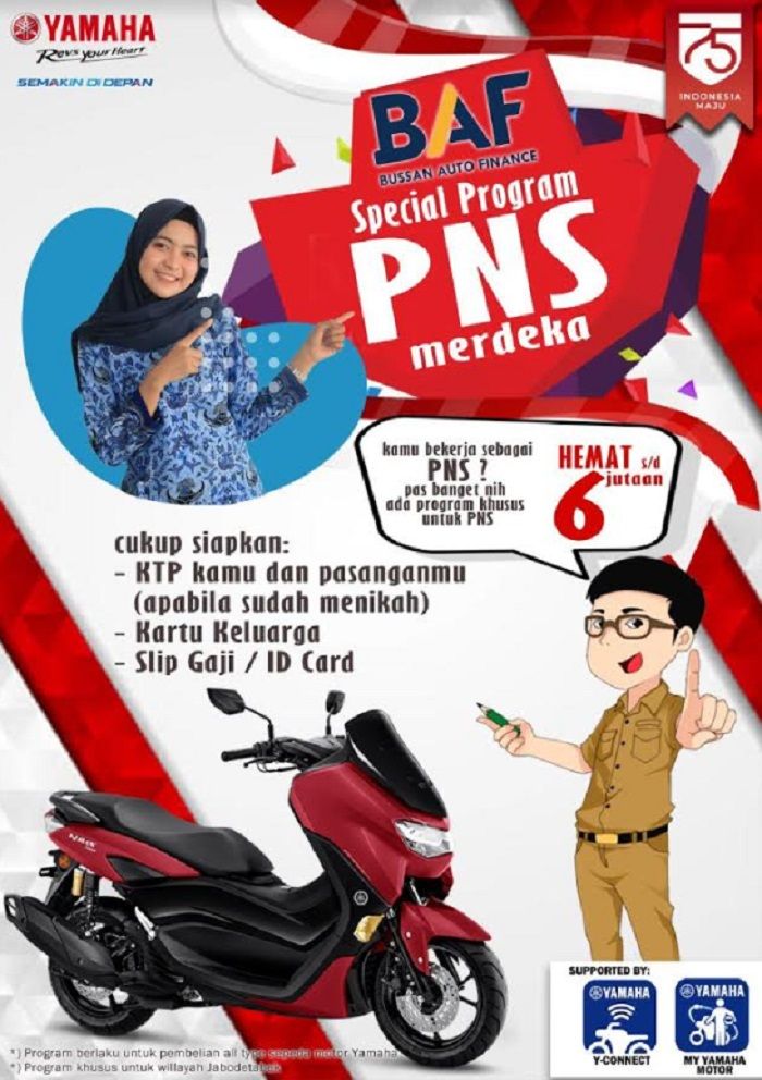 Menyambut Hari Kemerdekaan Republik Indonesia ke-75, Yamaha bersama dengan BAF telah mempersiapkan program spesial PNS Merdeka untuk para Pegawai Negeri Sipil (PNS) di seluruh area Jabodetabek.