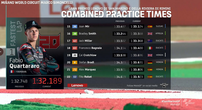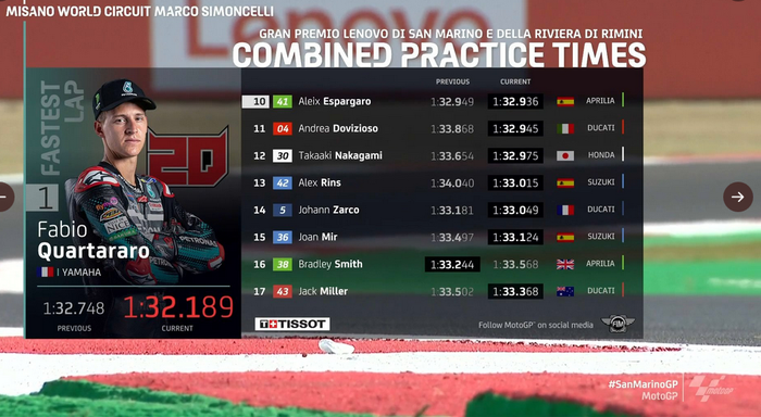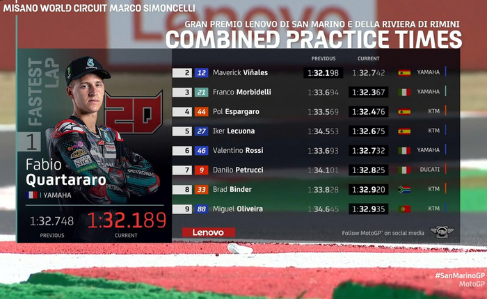 Akhirnya di akhir sesi FP2, Fabio Quartararo keluar sebagai yang tercepat, dengan raihan waktu 1:32,189