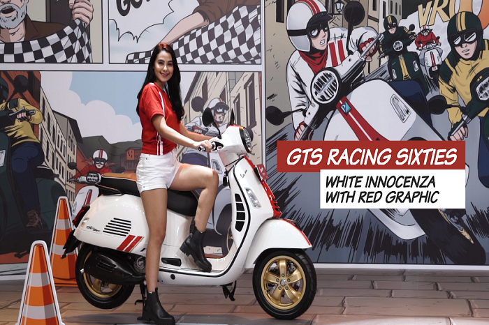 Selain itu, kelir putih dengan garis merah yaitu Vespa GTS 300 HPE Racing Sixties.