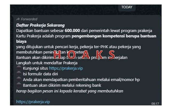 Modusnya, bikers atau warga lainnya wajib daftar ke link prakerja.vip supaya dapat bantuan yang beredar di grup WhatsApp.