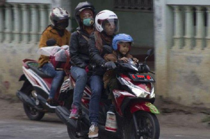 MOTOR Plus-online.com - Jangan lagi bonceng anak-anak di depan, tega bener anak sendiri dijadikan airbag.