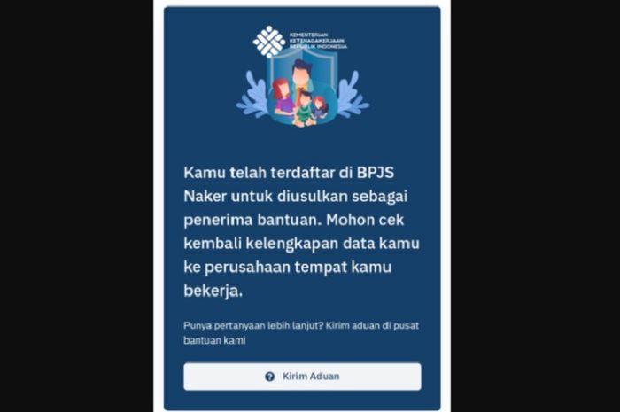 Salah satunya, notifikasi untuk melengkapi data pekerja, yang muncul saat pekerja mengecek apakah mereka terdaftar sebagai penerima BSU atau tidak di laman Kemenaker.