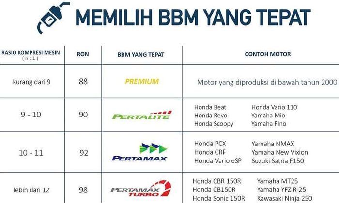 Pertamina mengarahkan motor dengan tahun produksi di bawah tahun 2000 rasio kompresinya kurang dari 9 supaya memakai bensin Premium.