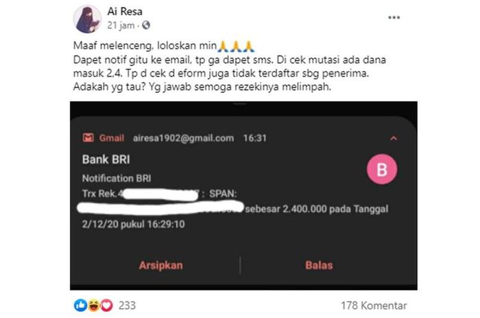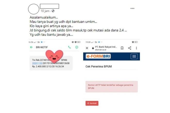 Mereka menanyakan mengapa adanya notifikasi dari BRI soal dana BLT UMKM sejumlah Rp 2,4 juta di SMS, tetapi ketika dicek di laman eform. bri.go.id statusnya tidak terdaftar.