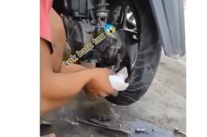 MOTOR Plus-online.com - Viral video tukang tambal ban yang pakai cara unik.