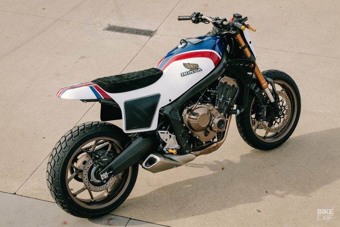 MOTOR Plus-Online.com - Gahar, modifikasi motor Honda CB650R street tracker, pakai livery HRC klasik!