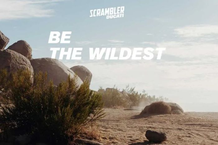 Di gambar teaser resmi ini, terlihat sebuah pemandangan gurun pasir dengan logo Ducati Scrambler.