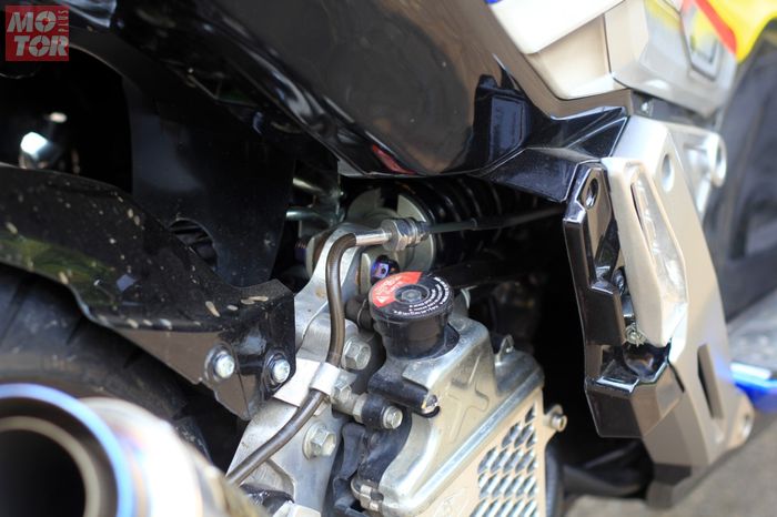 “Bikin braket di rangka dengan dilas. Habis itu engine mounting diturunin sedikit, kalo gak, monosoknya mentok rangka. Monosoknya pakai Ohlins non tabung untuk R15,” paparnya.