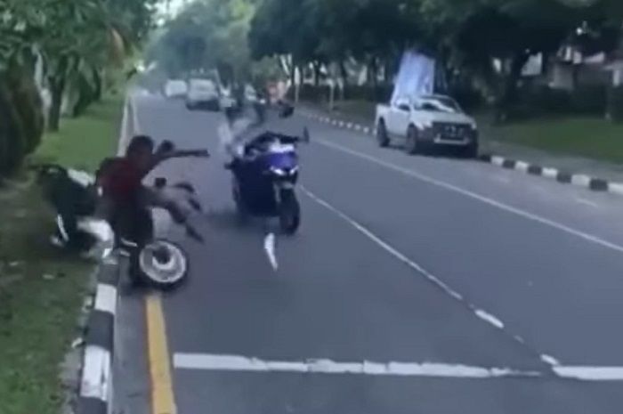MOTOR Plus-online.com - Geger detik-detik motor kebut-kebutan makan korban, bodi motor sampai hancur berantakan.