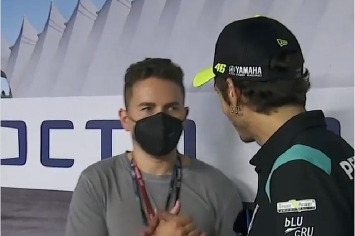 MOTOR Plus-online.com - Mantan pembalap MotoGP, Jorge Lorenzo tampak dingin saat bertemu Valentino Rossi di MotoGP San Marino 2021, ada apa ya?