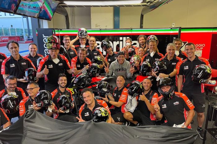 Untuk itu, Aleix Espargaro memberikan penghargaan kecil kepada seluruh kru dan mekaniknya dengan membagikan helm.
