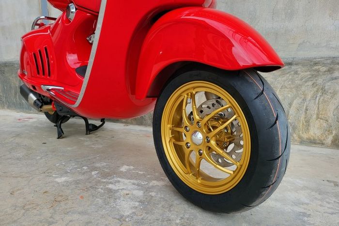 Apalagi warna pelek emas terlihat kontras dengan warna bodi utama di Vespa 946 Red ini.