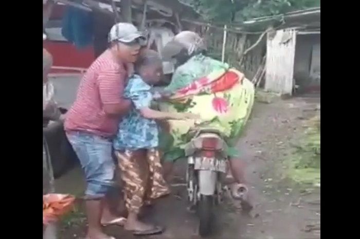 MOTOR Plus-online.com - Bikin terharu lihatnya, nenek-nenek ditolog warga pakai motor saat Gunung Semeru meletus.