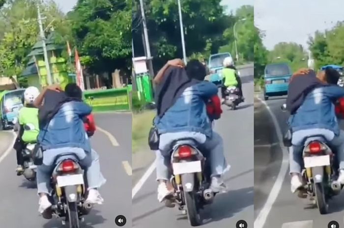 Dalam video tersebut, terlihat seorang pria dan wanita berboncengan di jalan raya.