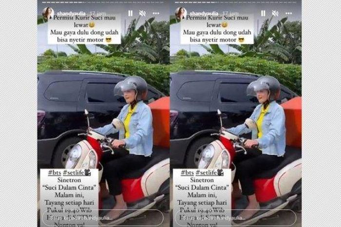 "Permisi kurir Suci mau lewat. Mau gaya dulu dong udah bisa nyetir motor," tulis Shandy.