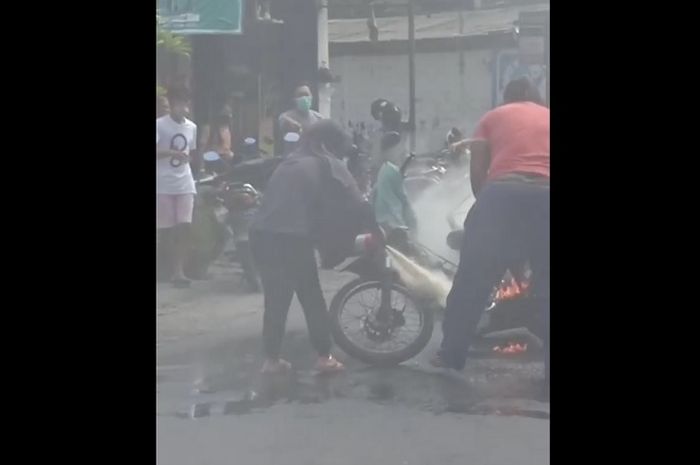 Motor tersebut terlihat tengah dilalap si jago merah yang tak kunjung padam.