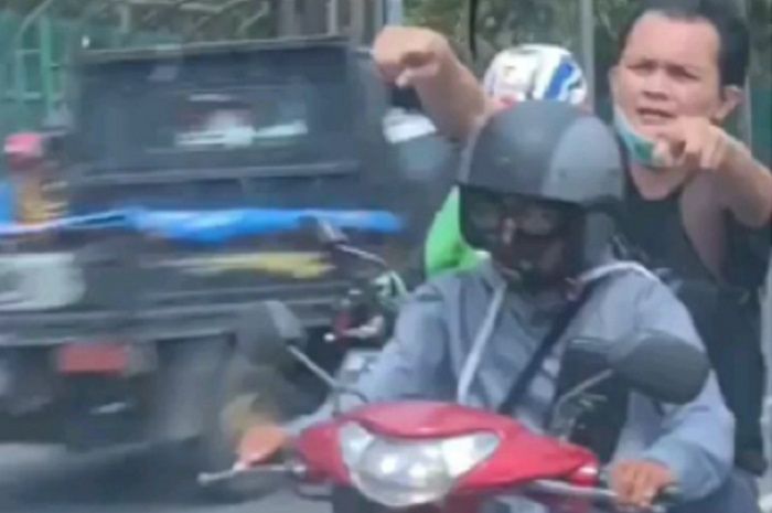 Sambil teriak dan menunjuk mobil, seorang lelaki dibonceng motor matic warna merah mengejar mobil.