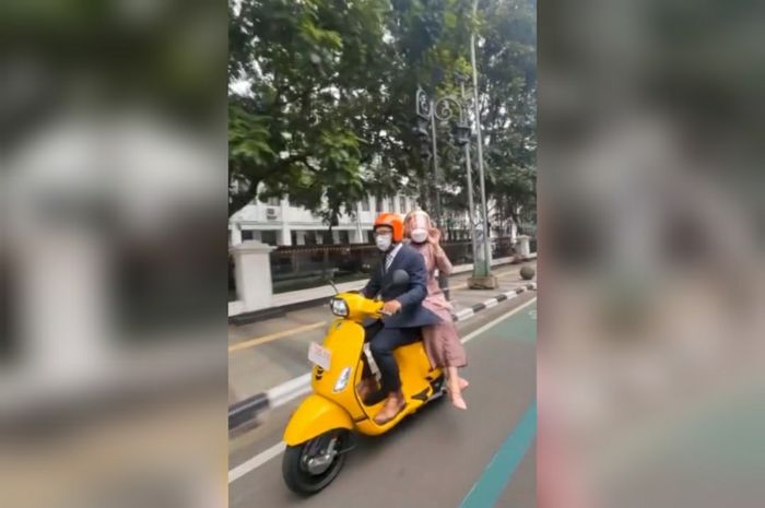 Gubernur Jawa Barat, Ridwan Kamil ampak mesra berboncengan dengan sang istri, Atalia Praratya naik Vespa Matic, tepatnya Vespa S 125.