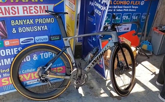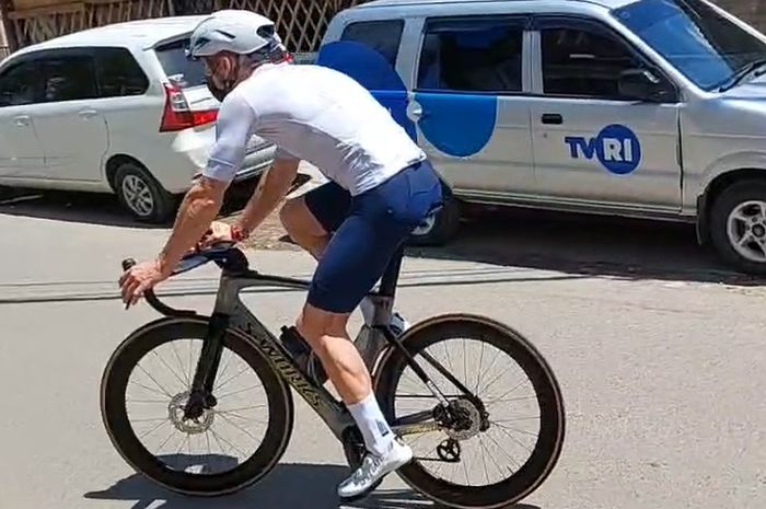 Sepeda yang dipakainya berjenis road bike.