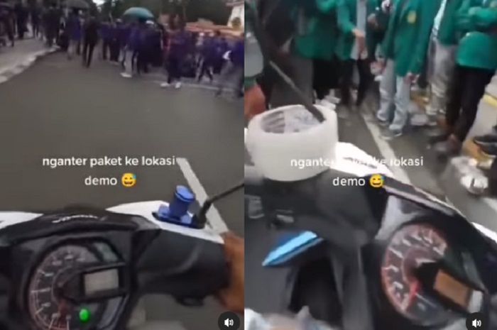 Namun di tengah demo mahasiswa tersebut, ada kejadian kocak yang dialami kurir paket yang mengendarai motor.