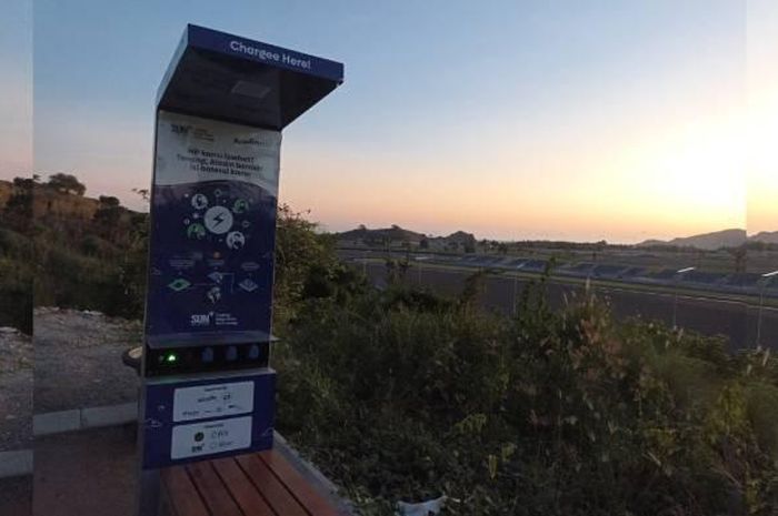MOTOR Plus-online.com - Sirkuit Mandalika, Lombok, NTB mempunyai charger handphone bertenaga surya, letaknya di tribun Bukit Jokowi.
