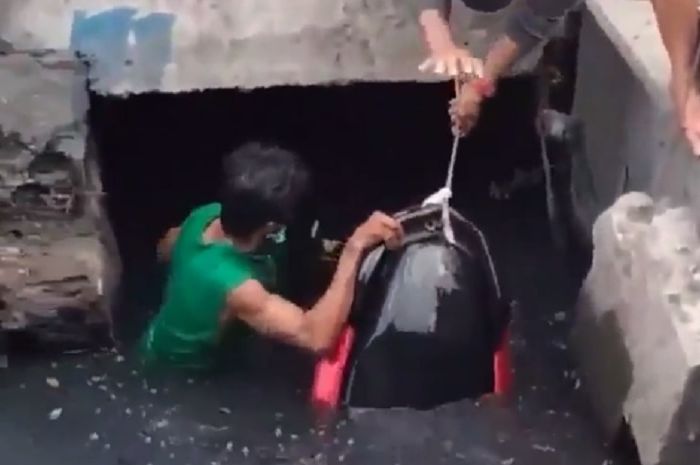 Terlihat dalam video tersebut seorang pria menceburkan dirinya ke selokan demi motor Yamaha NMAX.